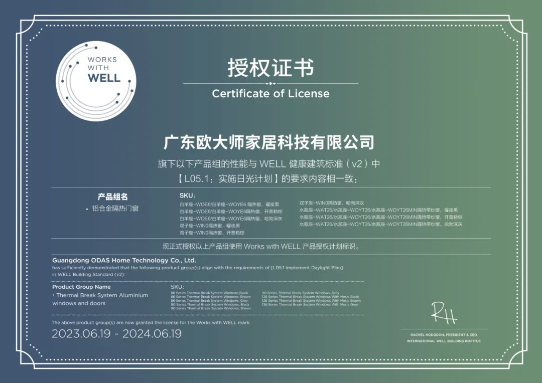 欧大师门窗一直致力于门窗产品的节能降碳,2023年6月,欧大师门窗宣布与国际WELL建筑研究院携手合作,正式成为WELL研发及管理单位IWBI的基石级会员,为健康人居贡献自己的力量。作为门窗行业首个加入IWBI的企业,旗下的产品组经过第三方独立审核,符合WELL健康建筑标准中“光”概念的相关要求。正式纳入国际WELL建筑研究院(IWBI)的"Works with WELL"产品授权体系。