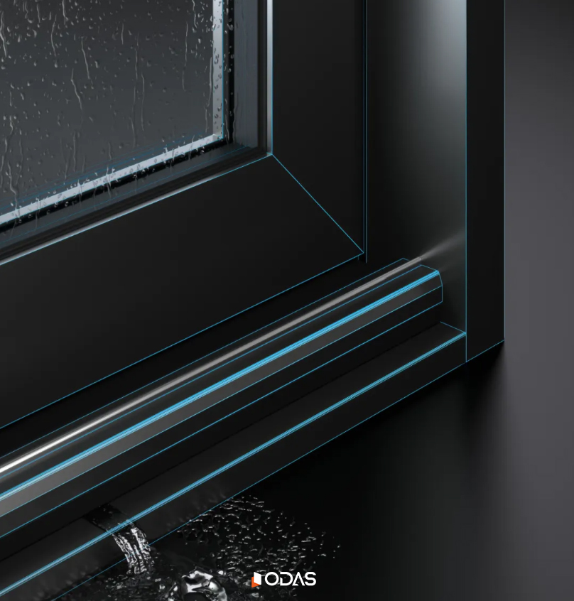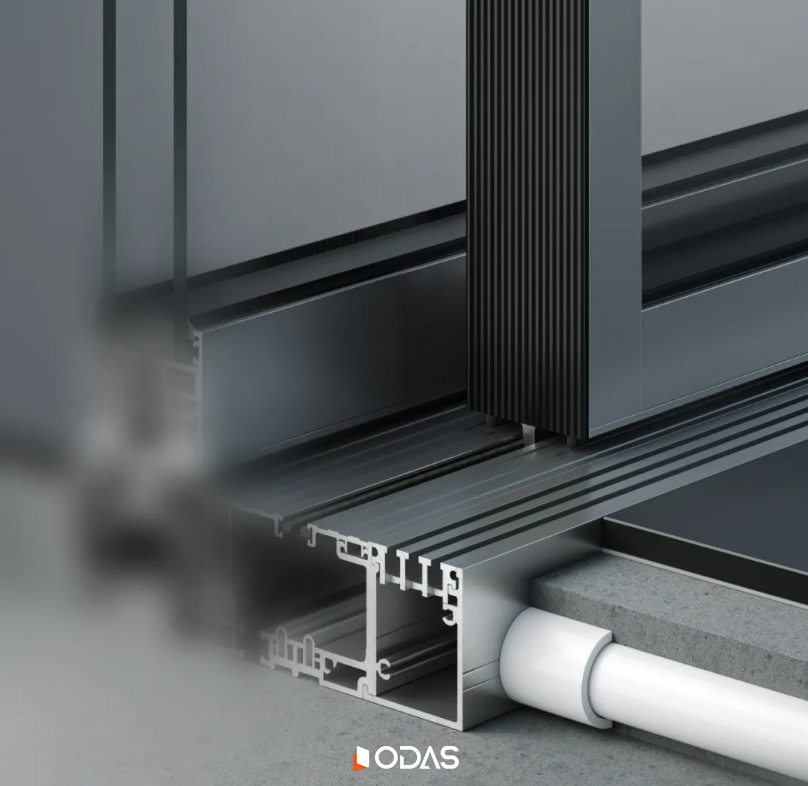 推拉门底部采用集成式排水轨道,连贯的双层过滤盖板,能够有效防止水流倒灌,整体水密性强。专利勾企结构的设计,可以有效减少推拉门勾企处的冷热传导,提升整体的保温隔热性能。