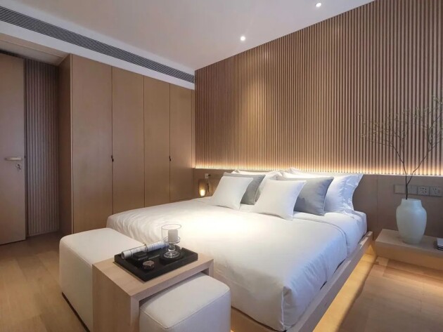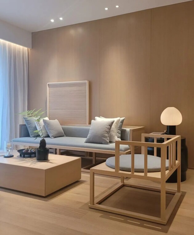 丁力学:在大坦沙凯德项目中,第一期样板房(疫情前)与第二期样板房(后疫情)截然不同,第二期开始我们注入了健康化因素。我认为设计师应顺应社会大环境、大趋势变化,关注影响生活品质与健康的因素,在样板房中针对不同消费群打造专属空间,提供治愈元素。比如针对 80 方左右小三房的年轻消费群(26 - 30 岁),用工业风材质、中古风软装,结合其社交场景、兴趣爱好(如摄影、烘焙)打造空间;而针对 50 岁以上人群,以现代东方风格呈现,摒弃符号化中式特征,打造可思考、具亲切感与松弛感的空间,家具也自行设计,融合传统与现代元素。
