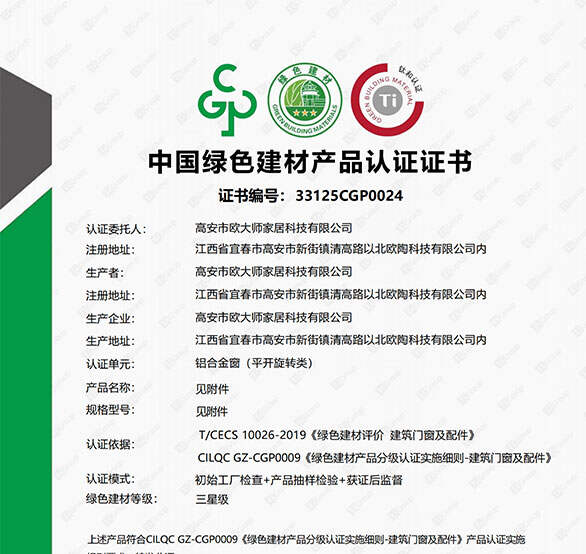 2025年7月,欧大师门窗成功通过国家权威机构评审,悦境95窄边内开窗荣获绿色建材产品三星级认证。该认证代表着国家权威机构对欧大师门窗产品安全节能、低能耗性、绿色环保特性的官方认可,表明欧大师门窗产品全生命周期契合绿色发展理念,是推荐使用的绿色建材产品。