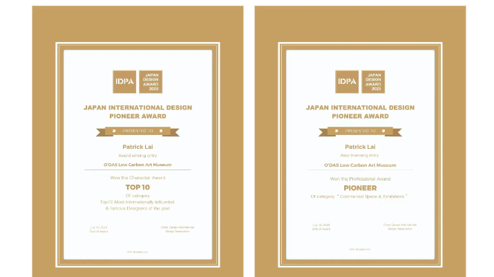 2023年7月18日,2023日本 IDPA AWARD 国际先锋设计大奖颁奖典礼于日本东京举行。欧大师低碳艺术馆 · 佛山居然店经过层层筛选,在全球众多顶尖作品中脱颖而出,斩获“日本 IDPA AWARD 国际先锋设计大奖”,同时,设计师赖柏全老师荣膺“日本 IDPA AWARD - 2023年TOP10国际影响力创新设计师”奖项!国际权威设计大赛日本国际