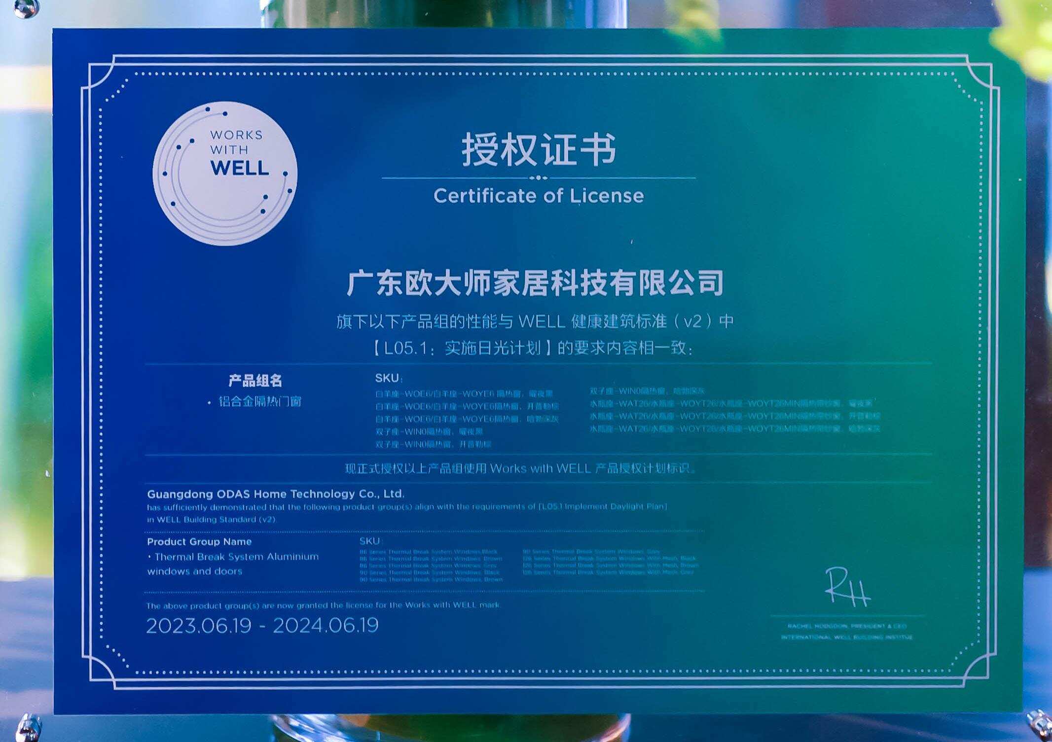 欧大师是目前国内门窗行业里首家成为IWBI会员并获得 Works with WELL 授权许可的企业。这是目前全球最具权威性与专业性的健康建筑认证标准,被誉为建筑界的奥斯卡。这一奖项标志着欧大师门窗系列产品以卓越的产品质量,达到了行业中低碳节能性能的领先地位。