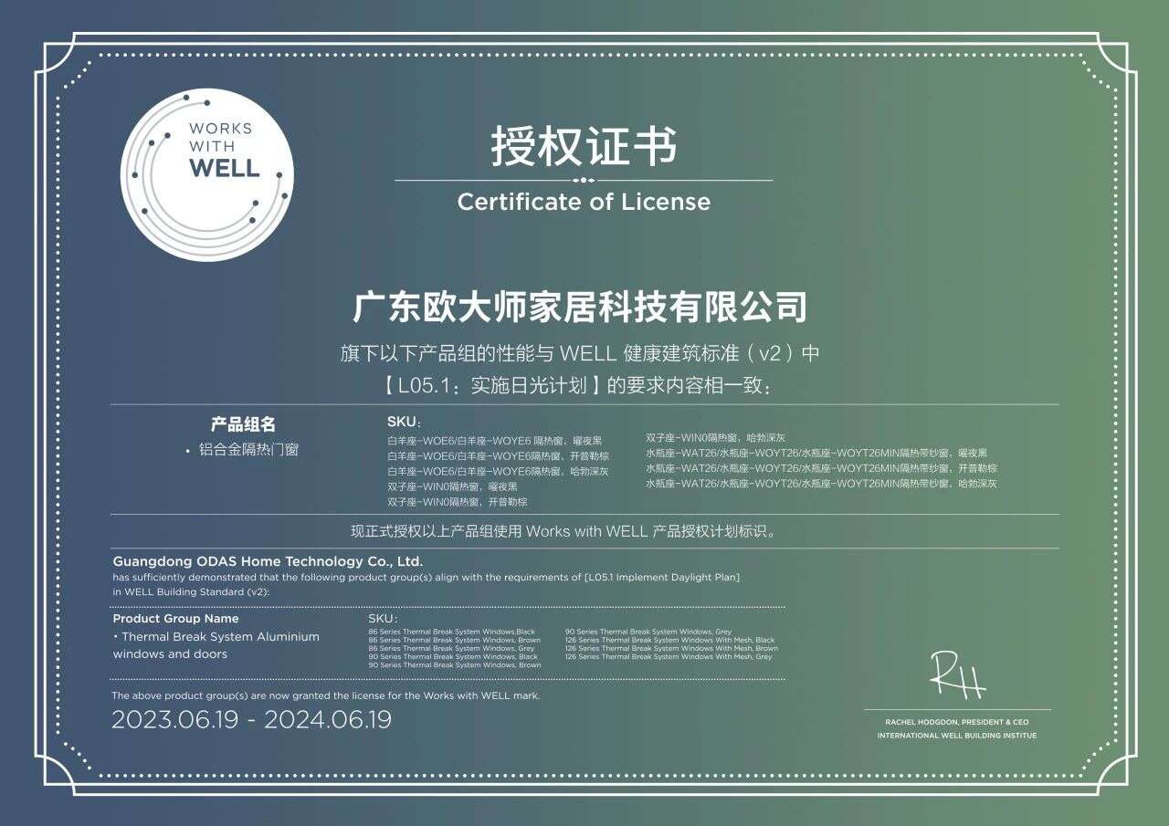 欧大师门窗自成立以来,不断突破技术壁垒,提升门窗综合性能。通过深耕细作,欧大师门窗荣获了国内外多项权威认证与荣誉奖项,包括“Works with WELL授权许可认证”、“门窗企业新一线品牌”、“2024年新质生产力领军品牌”、“2024年度中国系统门窗行业最具加盟价值品牌”等,每一项荣誉都是对欧大师产品品质与创新能力的有力证明。这些殊荣不仅彰显了欧大师门窗品质在行业内的领先地位,更是对消费者信赖与支持的最好回馈。
