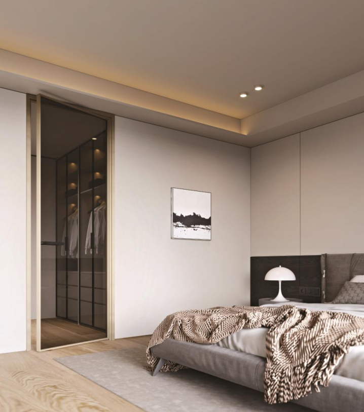2. 在材料上,因为门的尺寸比较大、自重更重,所以对五金、型材与玻璃等部件的性能要求更高。一般建议采用加厚型材和缓冲静音型隐形五金。