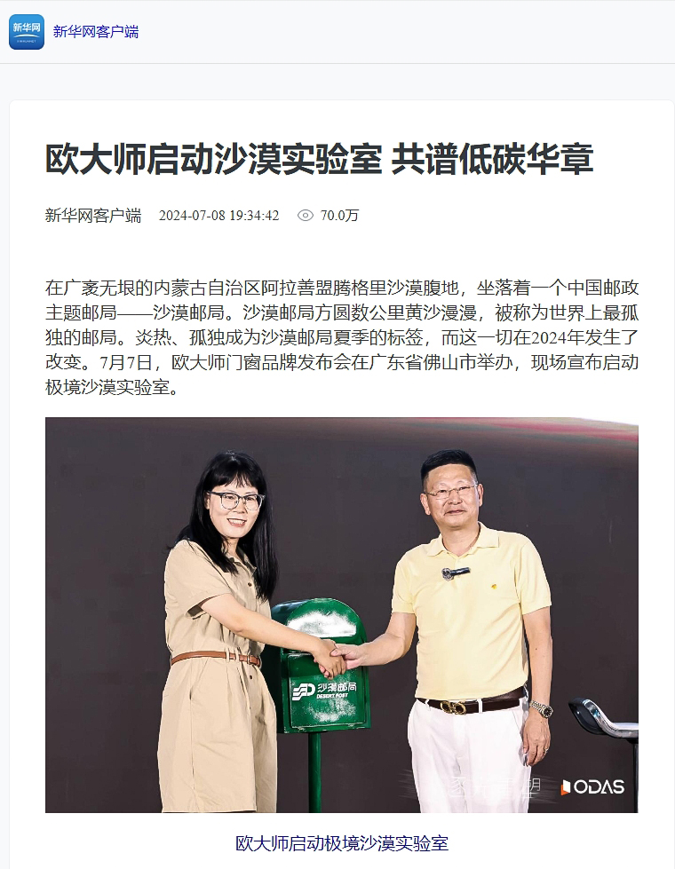报道中指出,欧大师门窗紧跟国家“3060”双碳政策步伐,通过持续的技术创新和工艺改进,不仅为更多家庭打造了恒温恒湿恒氧的健康人居环境,更为推动门窗行业的绿色发展和国家“双碳”目标的实现贡献了重要力量。期待欧大师极境沙漠实验室能带来更多惊喜,同时欢迎更多的朋友亲临沙漠邮局,深入了解低碳生活的理念和实践。