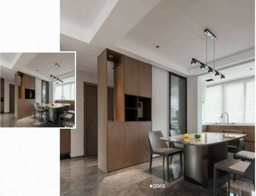 中西分厨设计,一道欧大师门窗的DPS115极窄推拉门,吊趟设计,滑动流畅,节省空间且有效阻挡厨房油烟外溢,门扇下轨滑动设计,轨道不易积尘,大大减轻了清洁工作的难度,同时有效避免了因灰尘堆积而导致的门扇卡顿等问题。