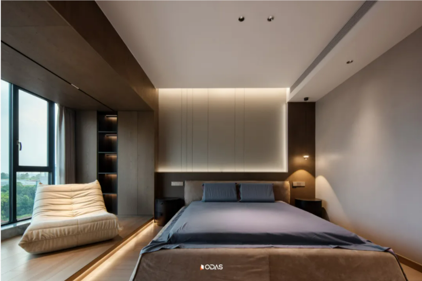 主卧设计基调为暖色, 深浅错落的背景墙增加空间的层次感,WO86外开窗构建开阔的落地窗区域放置一个休闲沙发椅,可以看书、独处、小憩、远望山景,配合柔和磁吸轨道灯光,营造充分放松的氛围,空间开合度把握得恰如其分。
