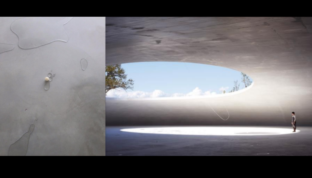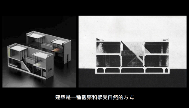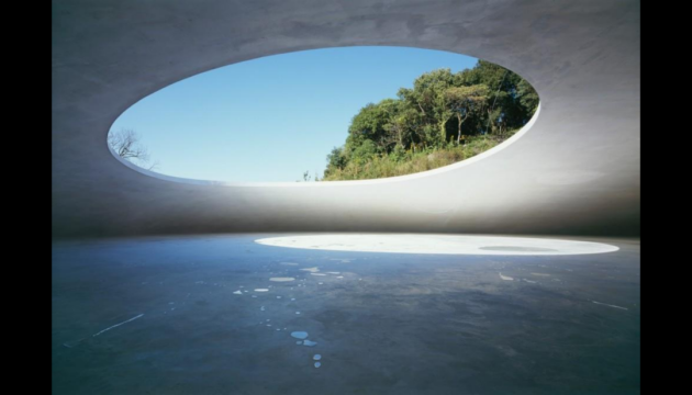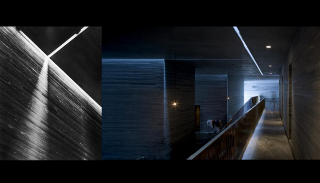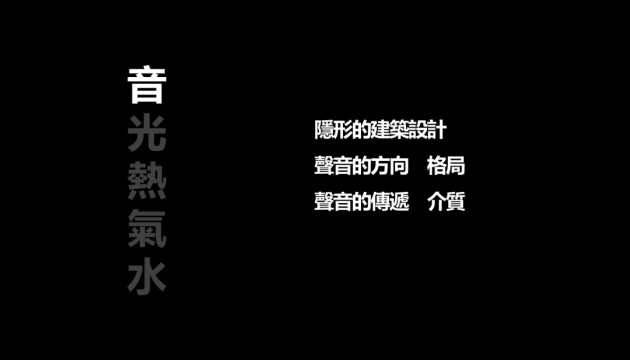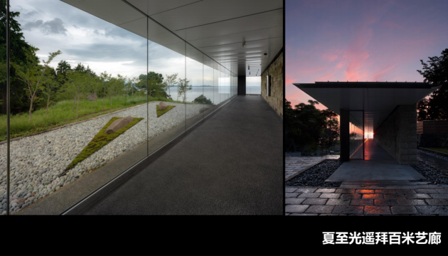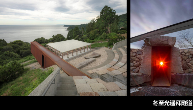 杉本博司也有个超厉害的作品,他花了 17 年做了一个观测气候的场所。在夏至那天,阳光会精准地穿过长廊,照到廊道对面的石头上,这个建筑在计算着日升月落的轨道非常准确。他还做了个能在冬天摇摆的廊道,有夏至廊道和冬至廊道,让人充分感受到阳光、海洋、气候和自然的变化,这就是跟自然互动、跟音光热气水完美融合的装置。