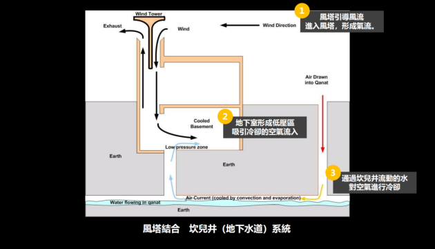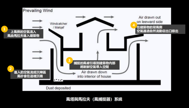 举个例子,在迪拜,有个穆罕默德文化理解中心,那是一座传统建筑,它采用了一种特别传统、巧妙的方法,把空气的热导流引入室内,当地叫 “风的捕捉器”,也就是马拉夫。通过冷热交换,新鲜空气进来,热空气对流出去,室内温度自然而然就降下来了。