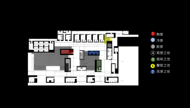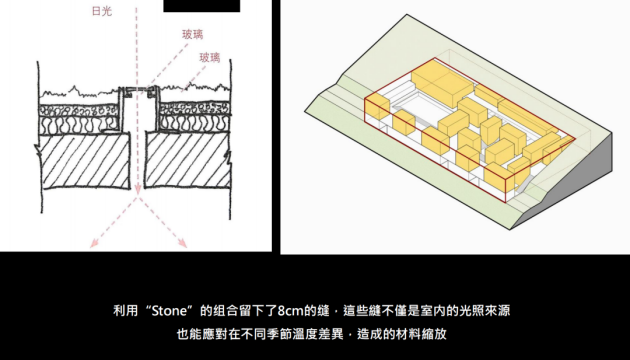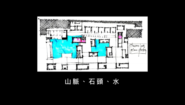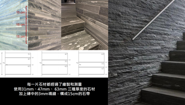 这浴场是用瓦尔斯当地的片麻岩建成的,而且在设计上有着精妙的数学关系。踏步是就是15公分,这个15公分就是有三个不同的尺寸 31、47、63 三种不同的厚度 再加上填缝的3厘米形成的15公分的一个数学关系的模组,然后组成了一个跟水跟山脉跟石头相连的一个一个设计。