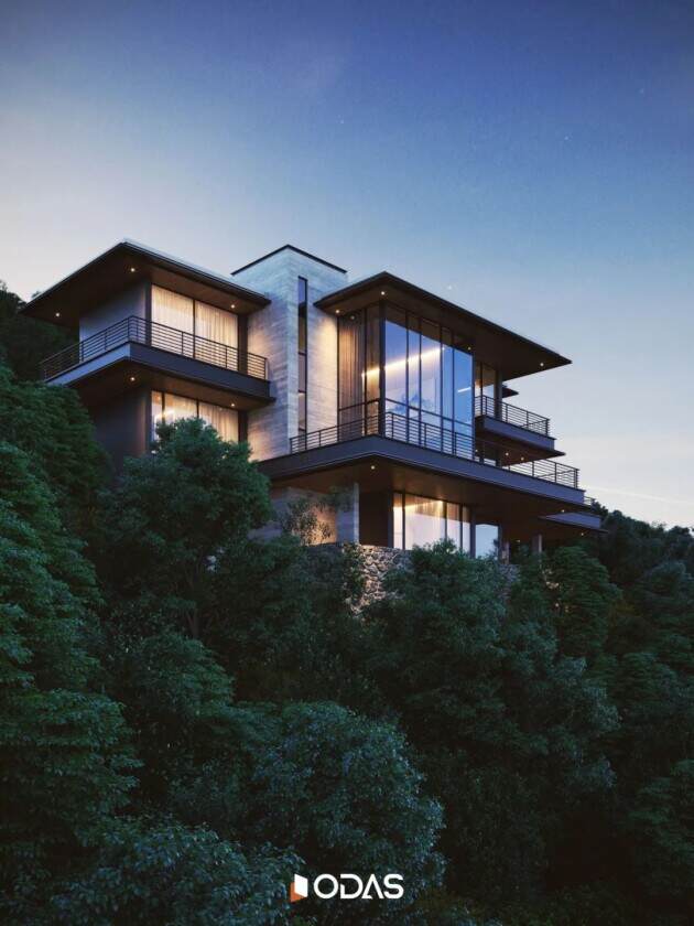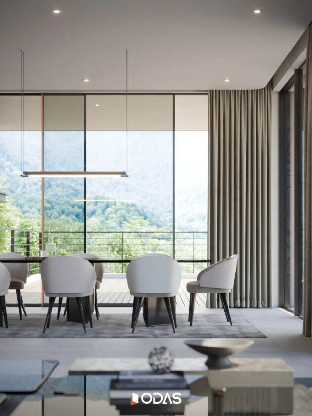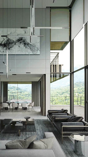 美好生活,是向阳而生,向心而居,更是情感的共鸣。设计首先要让人们感受到光。别墅私邸充分利用周边的自然景观,通过大面积的玻璃幕墙窗将山景引入室内。这种外墙设计核心在于缩减门窗框架的视觉占比,以减轻建筑的沉重感。让更多的自然光线与户外景致涌入室内,体现人与自然和谐共生的设计理念。