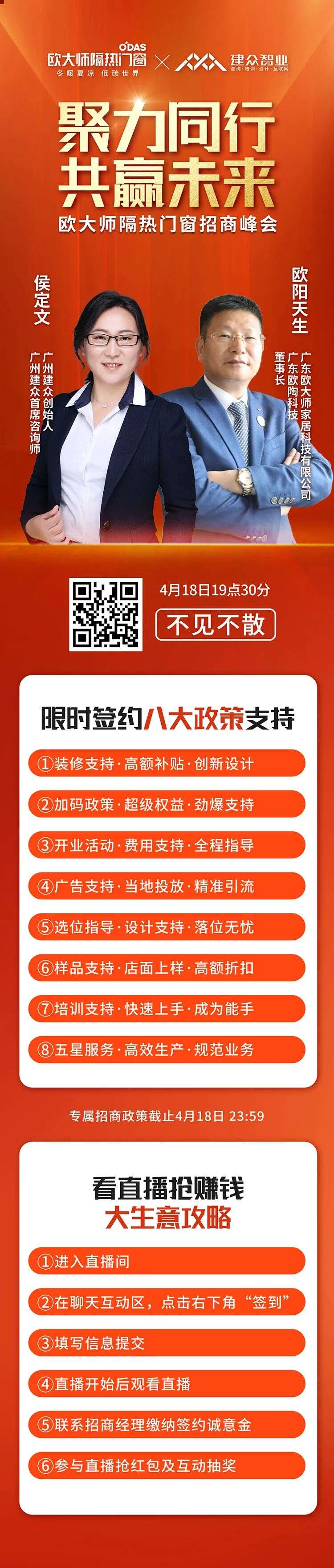 4月18日19:30,2022年欧大师隔热门窗招商峰会全国直播盛大开启。相约直播间,红包抽奖享不停,更有行业大咖亲临直播间,与全国各地的行业精英和意向经销商分享门窗行业财富商机。