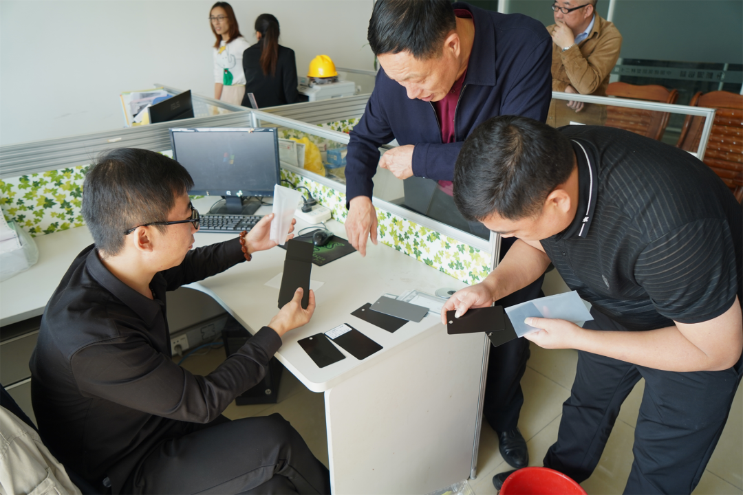 在表面性能室和老化室,技术员向欧阳董事长展示了多个新表面处理系列,其中氟碳喷涂、隔热工艺吸引了欧阳董事长的兴趣,并详细了解该产品的各类性能参数。